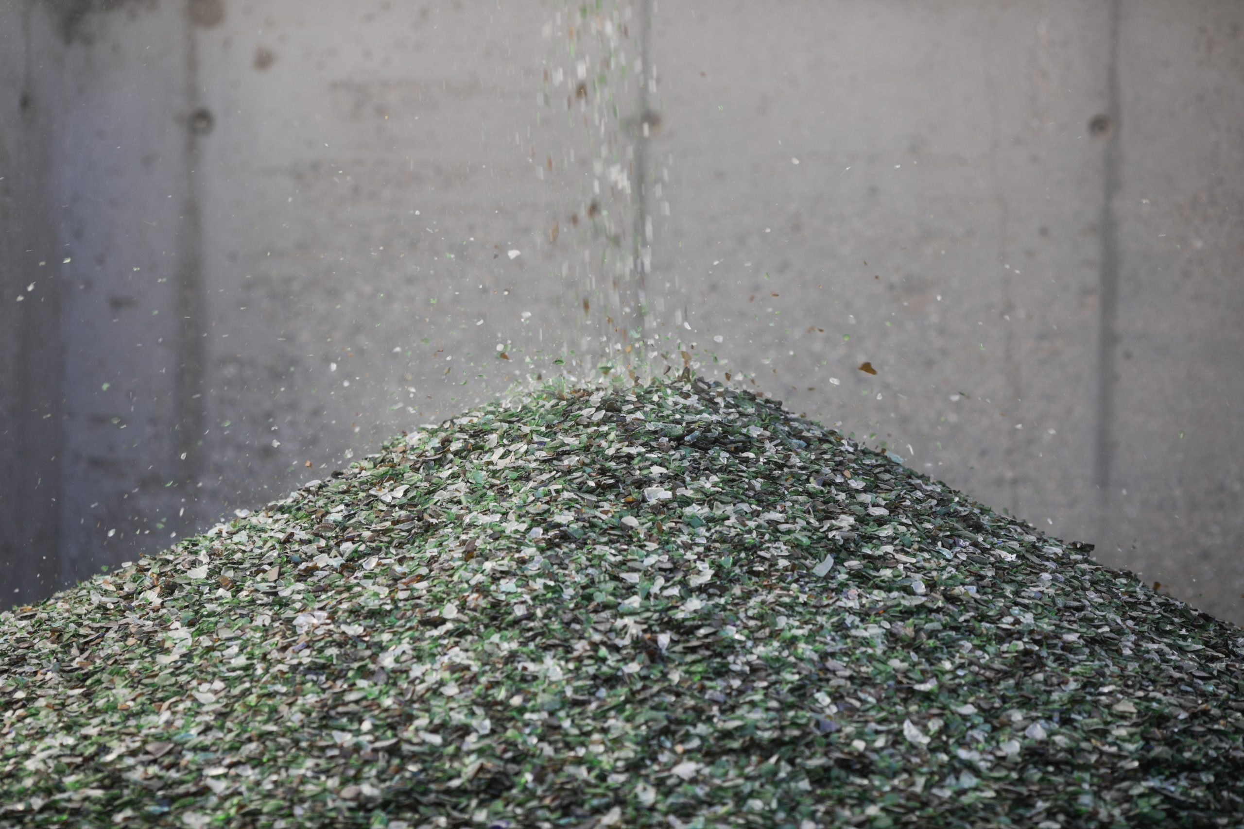 Once cleaned and sorted, the glass is shredded into small pieces, known as cullet.